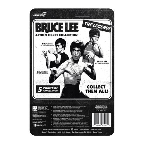 Be like water – or plastic – with this Bruce Lee Jacket 3 3/4-Inch ReAction Figure! The martial arts star is ready to make an apperance with your favorite action figures and toys. Packaged on a 6-inch by 9-inch cardback, the figure is jointed and will fit on your ReAction Figure shelves (or pegs) perfectly! Ages 14 and up.